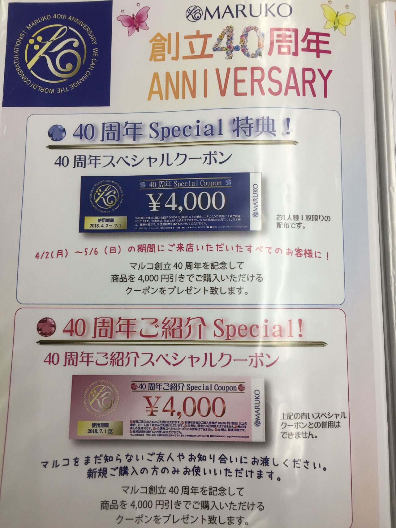 40周年の記念に、商品を4000円引きで購入頂けるクーポンをプレゼントさせて頂いております♬
