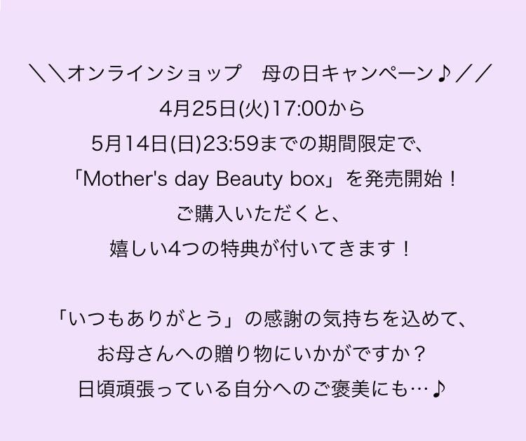 - ※母の日キャンペーン期間中は、Mother's day Beauty boxをご注文されると、納品明細書が同梱されません。マイページにてご注文内容をご確認ください。