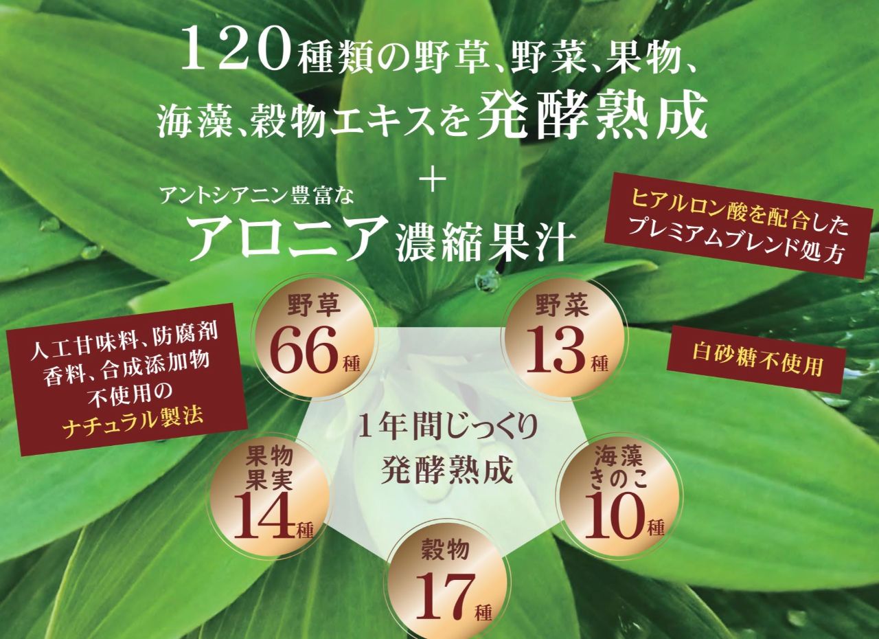 120種の野草、野菜、果物、海藻、穀物などのエキスを発酵熟成。
