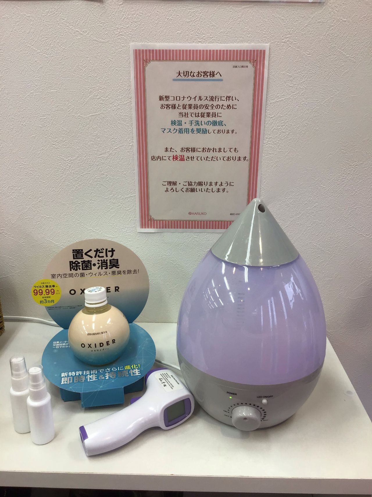 ご来店時にはお客様にも検温・手の消毒をしていただいてます。