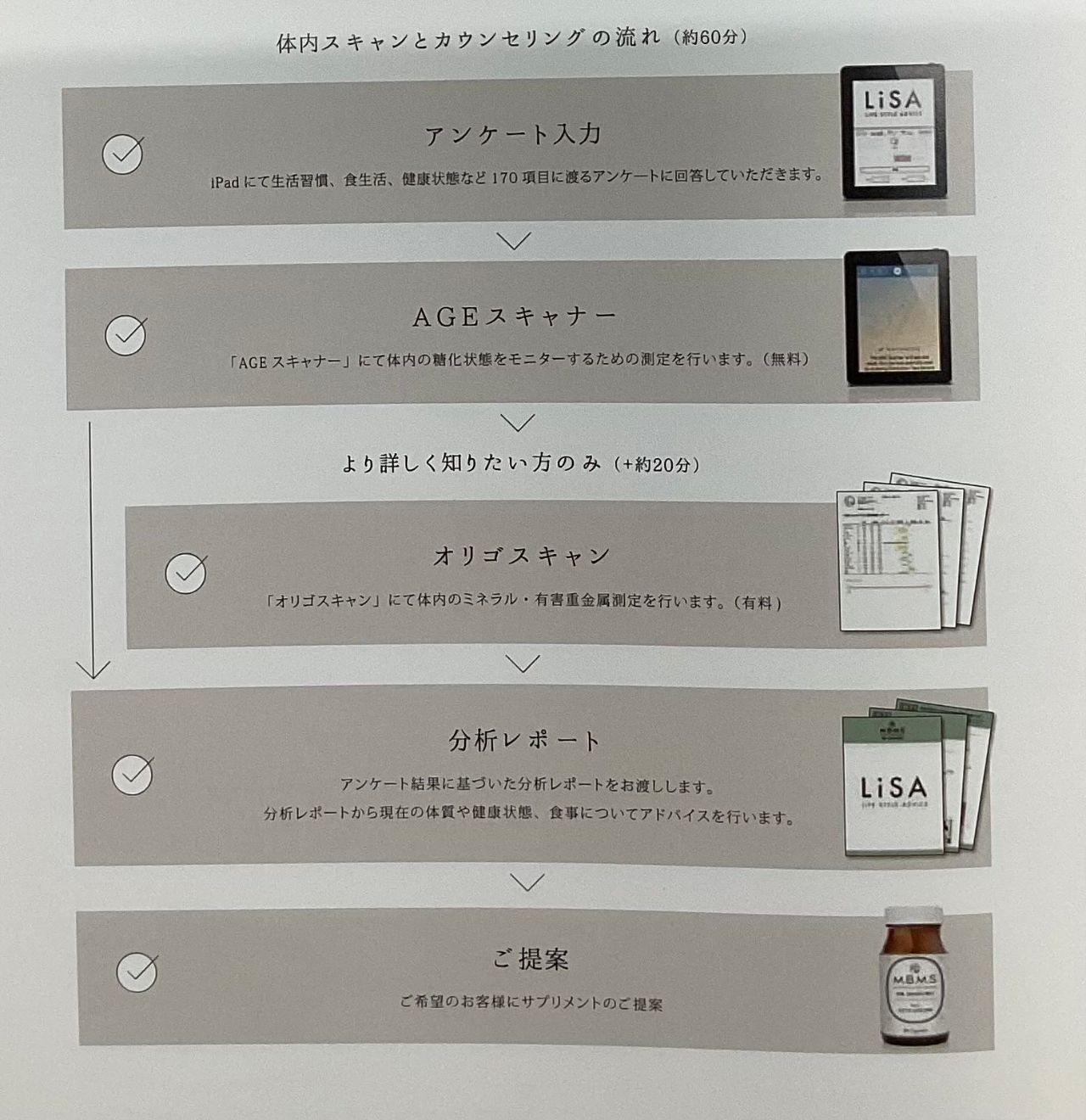 生活習慣、食生活、健康状態などの170項目によるLiSAアンケート、糖化度(見た目年齢)が分かる糖化測定、体内のミネラル量・有害重金属測定をできるオリゴスキャン(こちらは有料になります)に基づいたレポートから、現在の健康状態や食事・生活習慣についてアドバイスをしてくれるんです!