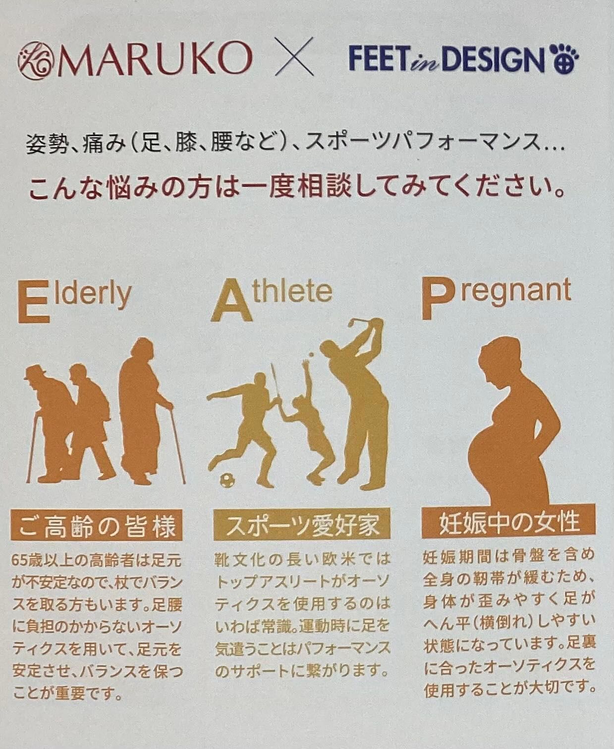 骨格補正の担当者になります。マルコの補整下着には、姿勢補整の機能も入っていますが、骨格の補正はできないですよね?そこで始まったのが、マルコアッセ(インソール)です。このマルコアッセを靴に入れることで骨格が補整され、体型の左右差がなくなったり、むくみが改善したり、膝・腰の痛みも改善される方が多いです!!素敵ですよね(*^^*)