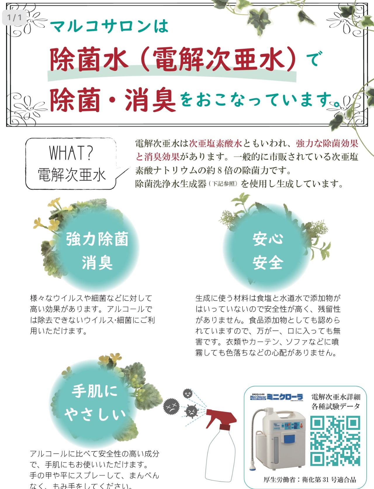 ❺加湿器に「次亜塩素酸水」を入れて、サロン内の除菌を行なっております。