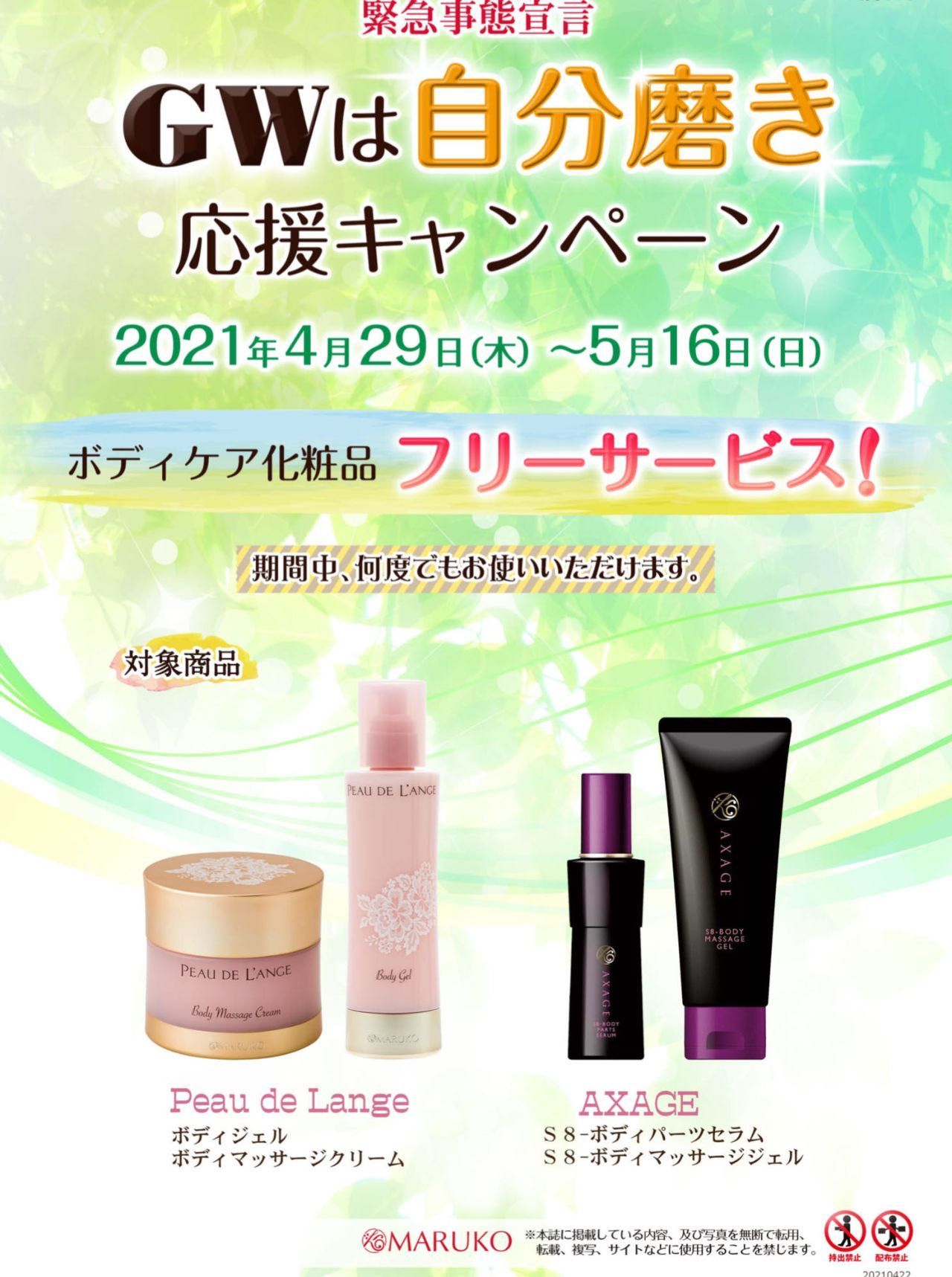 GW特別企画として美しさに磨きをかけてお客様が体型変化を楽しんで頂けるようアフターサービスではボディケア化粧品が使い放題☆