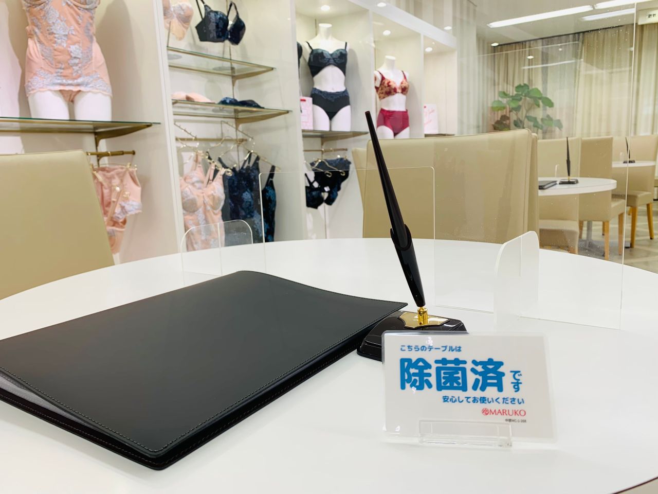 まだ除菌していないテーブルは札が伏せてあります。