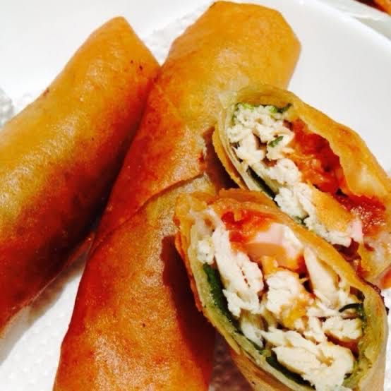 鶏ひき肉、玉ねぎ、梅干し、青じそを混ぜて作るタネを春巻きの皮で包んで焼き上げるだけ。