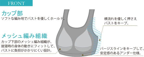 カップ下部のメッシュ編み組織が、就寝時の身体の動きにフィットして、バストに負担がかかりにくい設計。
