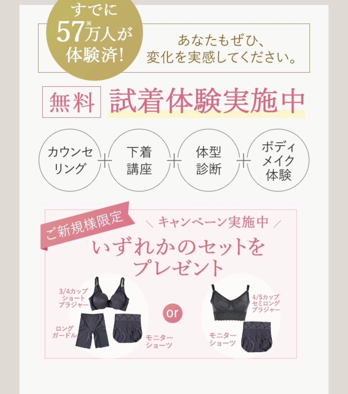 8月31日まで、無料試着体験にご来店いただいたご新規様には、上下のセットでプレゼント実施中です。