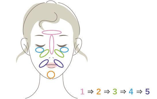 ブラシに適量をとり、鼻筋・おでこのTゾーン、あごの上、目の下にハの字、目元、ほうれい線など気になる部分をカバーしてください。
