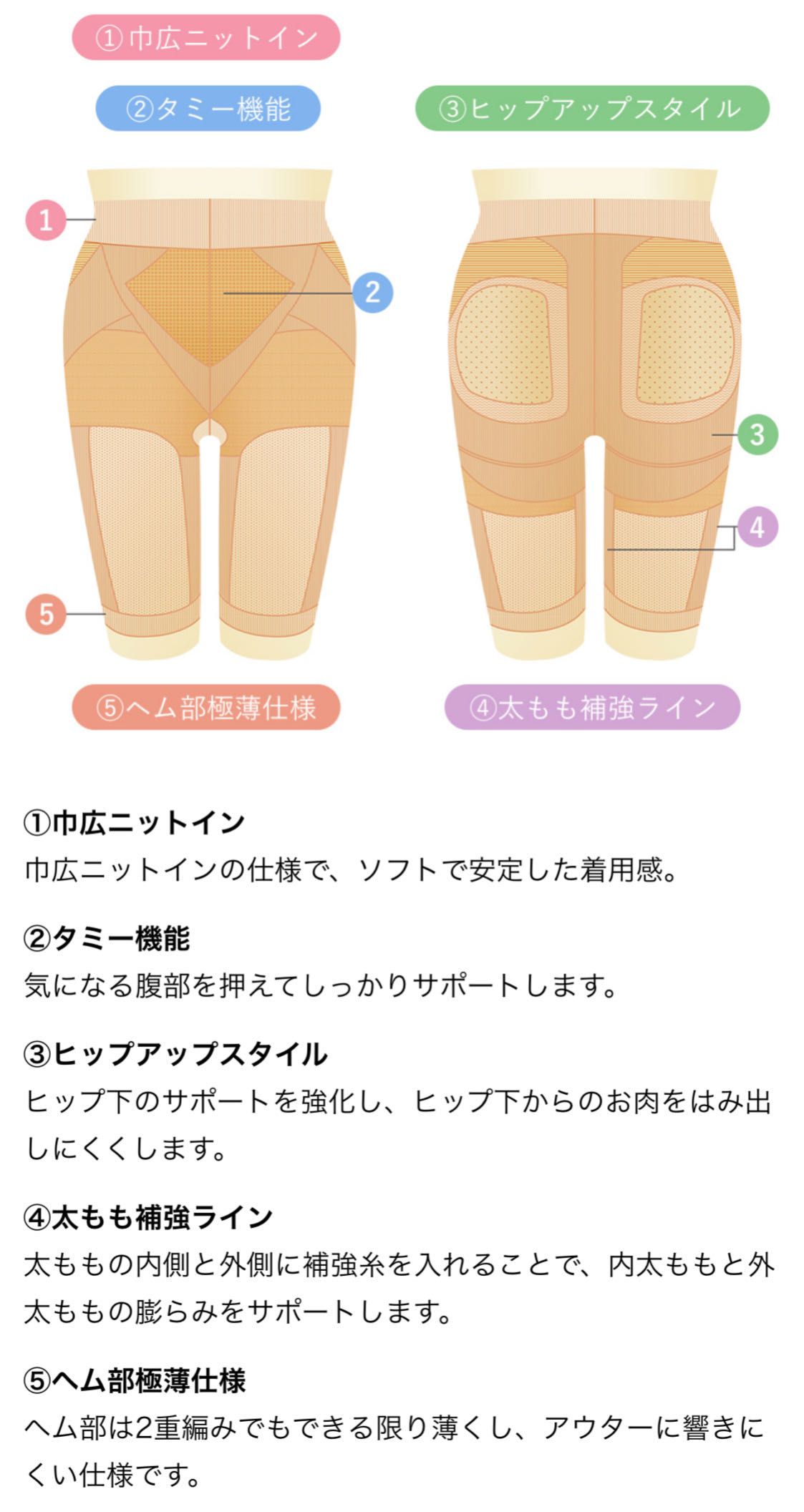 「サポートインナーボトム」はストッキング素材の4分丈ボトムとなっており、ショートガードルやボディスーツの日の気になるヒップ下をサポートし、美しいケジメラインに仕上げます。また太ももの内側と外側に70Dポリウレタン補強糸を使用し、内ももと外ハリの膨らみをサポートします。