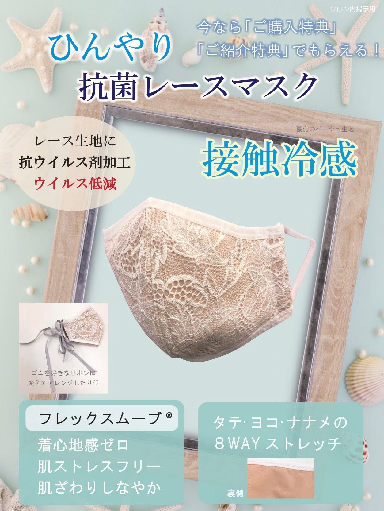 マルコでは、ご購入の特典&ご紹介の特典で、オリジナルの「ひんやり抗菌レースマスク」をプレゼントしております!