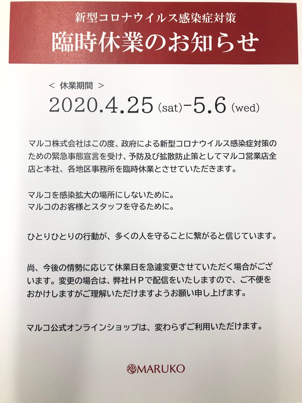 5月7日からは通常営業をする予定ですが、変更がありましたら再度お知らせいたします。