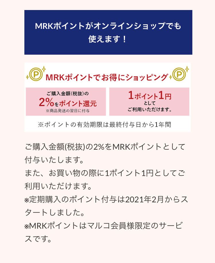 これまでは、店舗に足を運ばなければMRKポイントが付与されませんでしたが、なかなかご来店が難しいというお客様からの声にお応えして、マルコ公式オンラインショップでもMRKポイントを使用することが可能です。