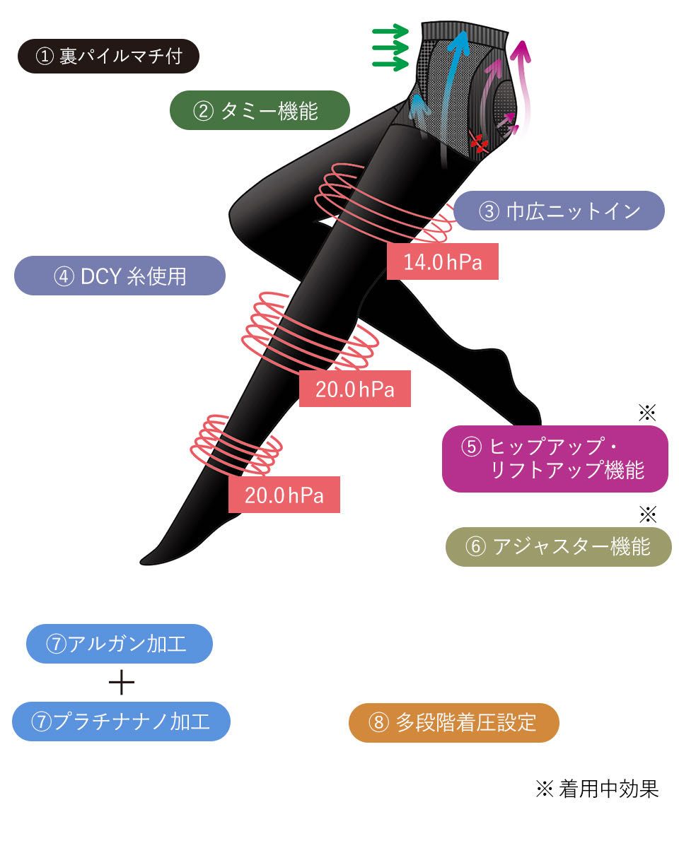 内腿部分にパワーの強い組織(サイサポート機能)を入れて支え、ヒップラインサポート機能でサイドを引き上げ、ニットインまで持ち上げるようにサポートします