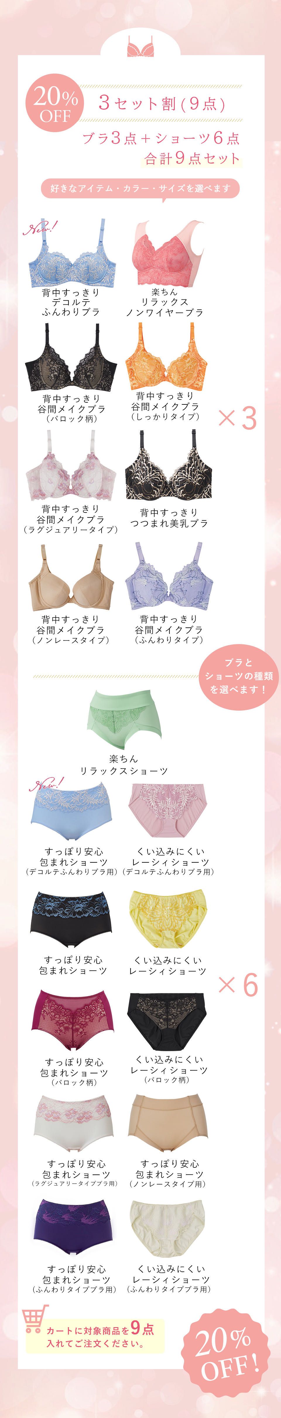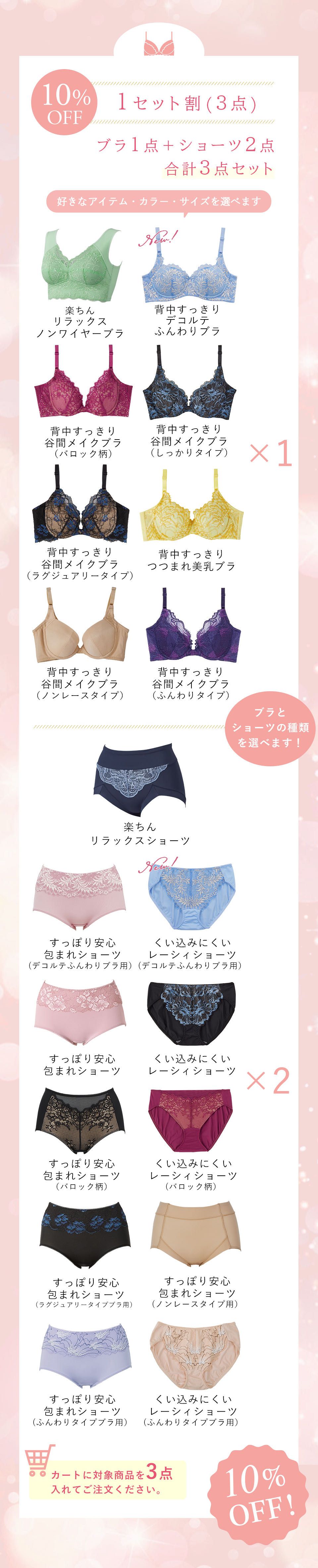 ショーツはくい込みにくいレーシィショーツ、すっぽり安心包まれショーツ、楽ちんリラックスショーツのいずれかです