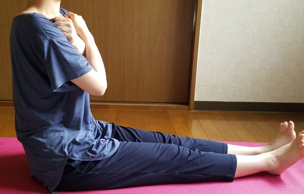 2.胸の前で腕を交差させます。この時、背筋をしっかり伸ばしましょう。