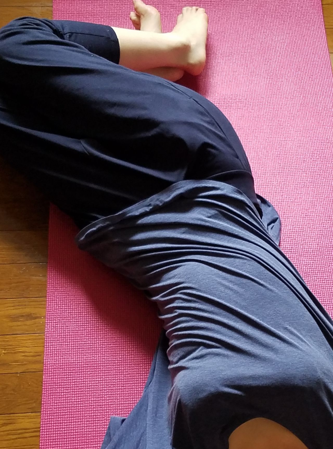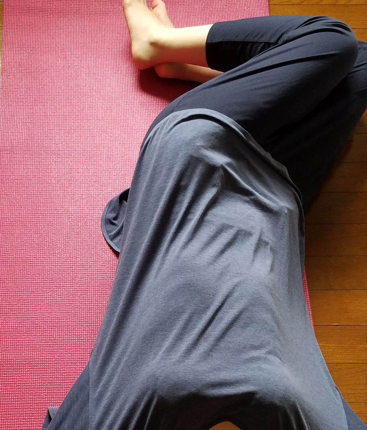 2.両膝をつけて、右にゆっくりと倒していきます。この時、しっかりと息を吐きましょう。